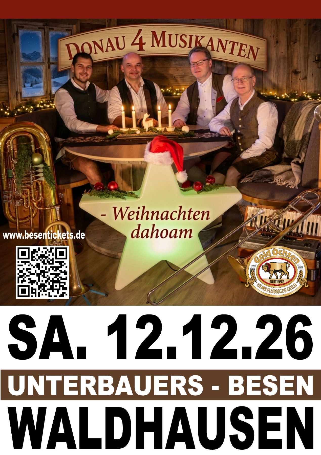 Am Samstag, den 12. Dezember 2026, wird es festlich und gemütlich in Unterbauers Besen: Im Rahmen ihrer Weihnachtstour „Weihnachten dahoam“ bringen die Donau4Musikanten echte Wirtshausmusi – klein, fein und voller Gefühl – auf die Bühne.
